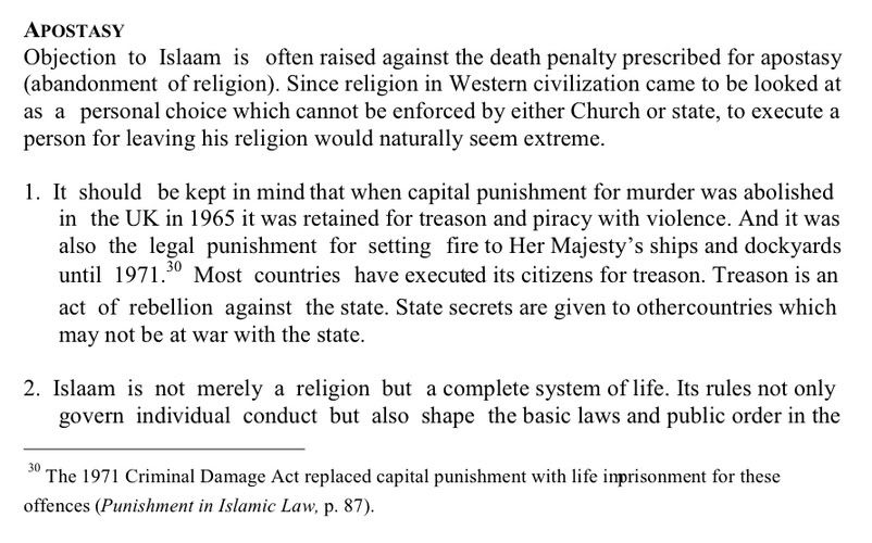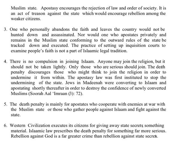 abandons his religion and the Muslim community". It should be noted that every country has maintained punishments, including execution, for treason and rebellion against the state (